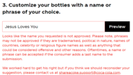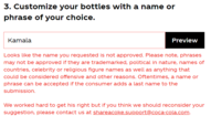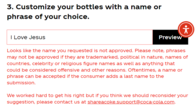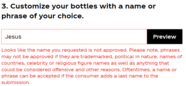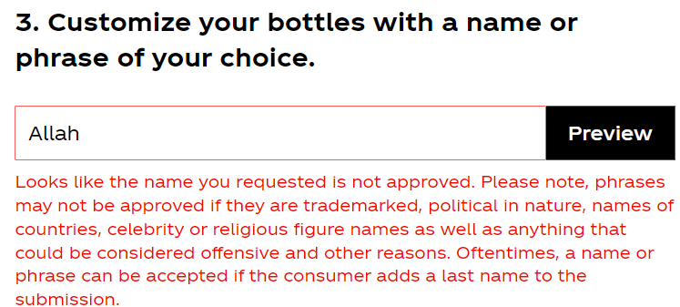 Next, we wanted to see if the rules for personalizing cans were against Christian values. To check this, we tried using names and phrases like "Jesus," "Allah," "Jesus Loves You," "Allah Loves You," "I Love Jesus," and "I Love Allah." The results were concerning. Both "Jesus" and "Allah" weren't accepted. "I Love Jesus" and "Jesus Loves You" were also not allowed, but "I Love Allah" and "Allah Loves You" were accepted, which suggests that Coke's personalization might not be against Trump but seems to lean against Christian messages.![]()