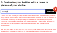 First, we conducted a comprehensive investigation to determine if the personalization restrictions were anti-Trump. We tested several names and phrases, including 'Trump,' 'Kamala,' 'Vote for Trump,' 'Vote for Kamala,' 'Trump Vance,' and 'Harris Walz.' Our thorough testing revealed that the results were consistently similar for all the names and phrases we tried. When we tried to personalize cans with the name "Trump," it was not accepted, and we received a message saying that the name wasn't approved. The message explained that some names might not be allowed if they are trademarked, political, the names of countries, celebrities, or religious figures, or if anything could be seen as offensive. Sometimes, adding a last name might help. Interestingly, the name "Kamala" was also not approved. However, phrases like "Vote for Trump" and "Vote for Kamala" were accepted, as were "Trump Vance" and "Harris Walz," which shows that while individual names might face restrictions, certain combinations or phrases can still be approved.![]()